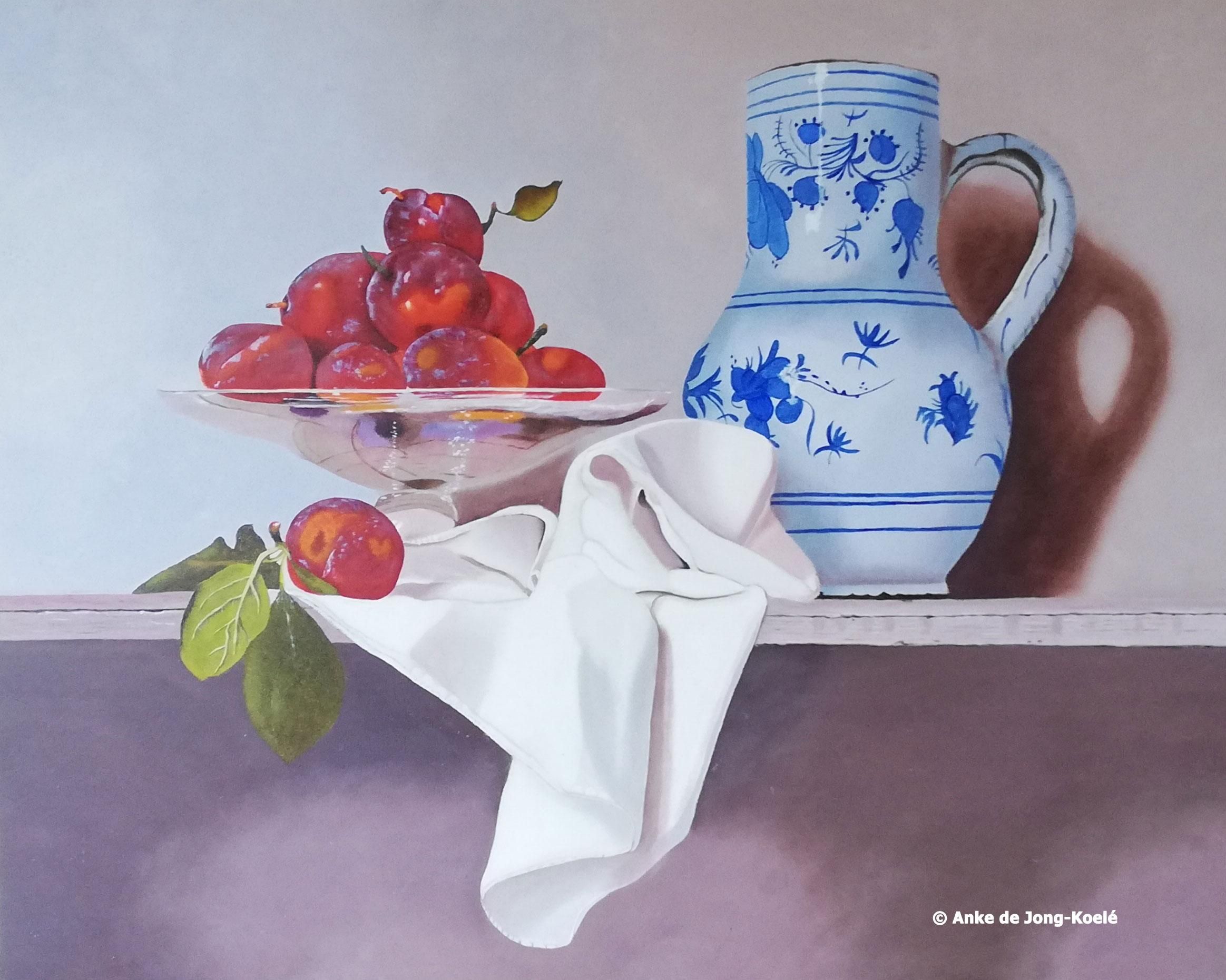 Kan met pruimen. Paneel 40 x 50 cm. Verkocht