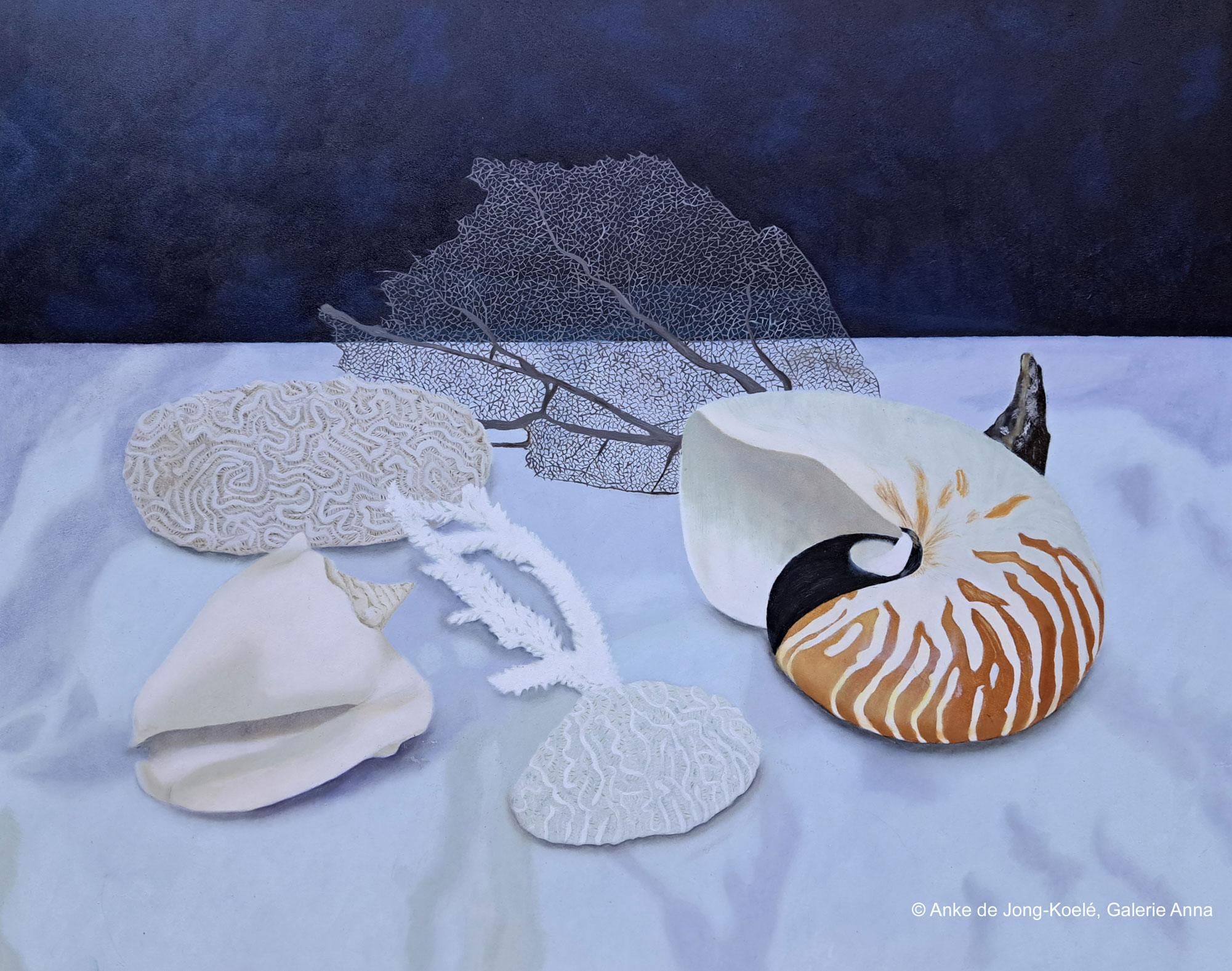 Schelpen met koraal. Paneel 40 x 50 cm. Prijs € 520,-
