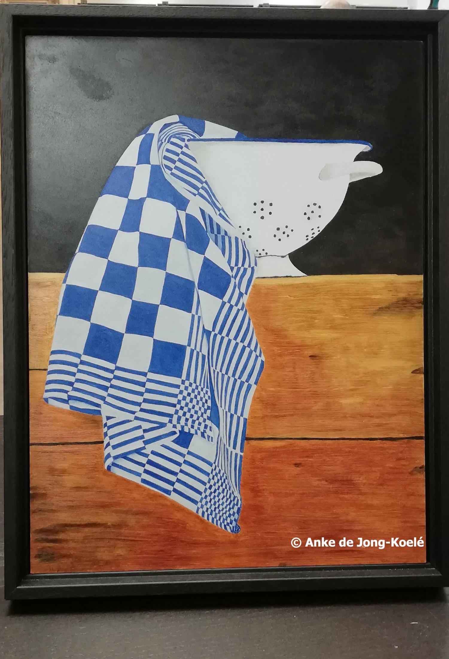 Theedoek met vergiet. Paneel 30 x 40 cm. Verkocht